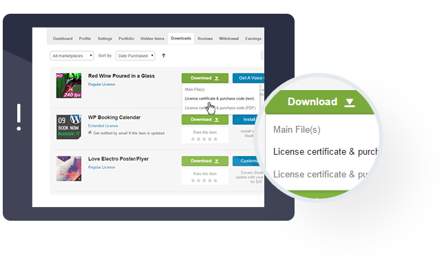 - Click “download” button, and in the drop-down menu select “license certificate & purchase code”.